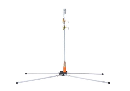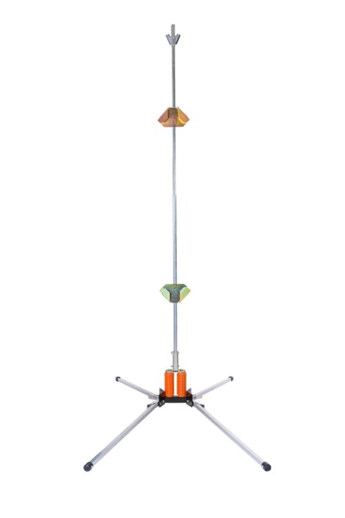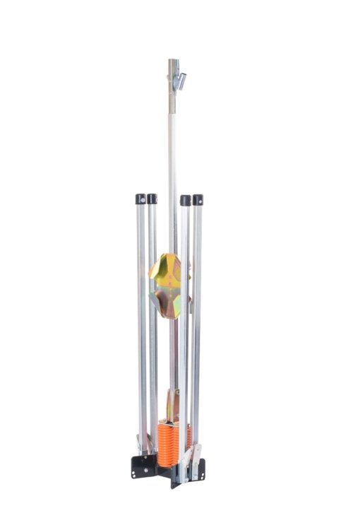 Mechanical pin leg release. - Telescoping mast elevates rigid signs 18” to 60” above grade and roll-up signs above grade.